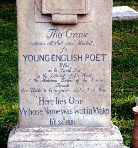 Se refiere a la tumba de Keats en el cementerio protestante (Nacido el 31 de octubre de 1795, moría a los veinticinco años, el 24 de febrero de 1821). Su amigo Percy B. Shelley, que murió poco después y está enterrado cerca de él, escribió: «El polvo al polvo irá. Su alma pura -ajena a la mudanza de las horas- ondeará otra vez sobre la ardiente / fuente de cuyas aguas procedía (…). Sí, vive, está despierto. Quien ha muerto / no es él, sino la muerte».